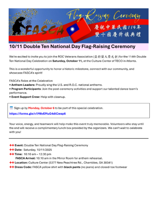 FASCA is honored to take part in the upcoming Double Ten Day Flag Raising Ceremony, celebrating Taiwan’s National Day. As part of the program, the FASCA Dance Team will be performing to showcase Taiwanese culture and spirit. We look forward to sharing this special tradition with the community!